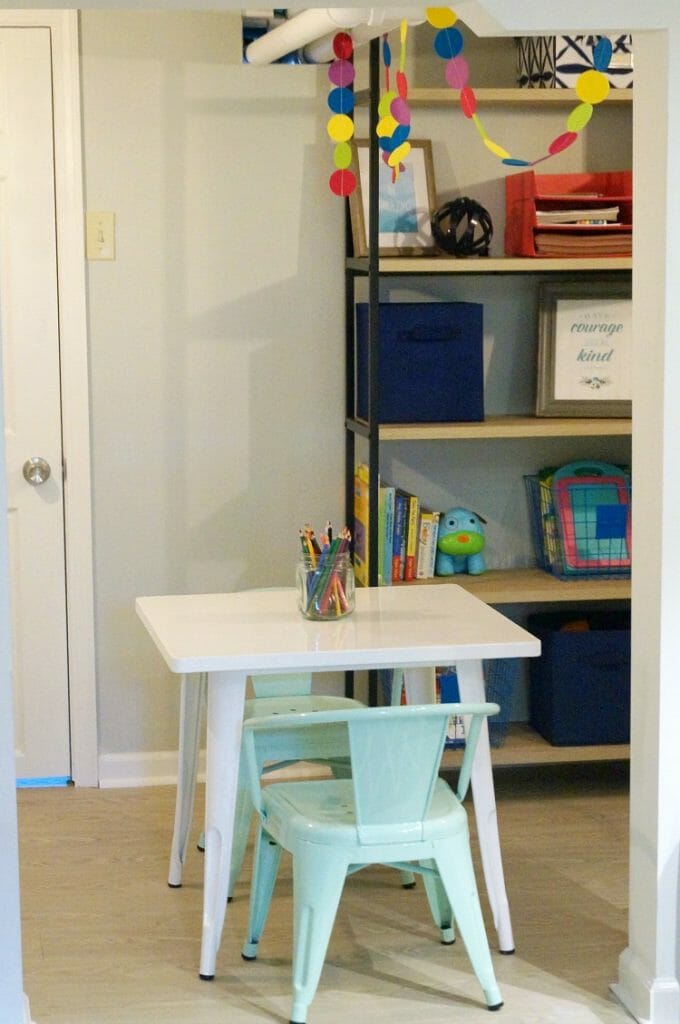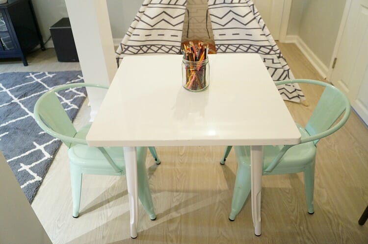 The table and chairs section and the teepee are truly my favorite part of the room. This little area is perfect for reading a book in the teepee or creating fun artwork on the little table!