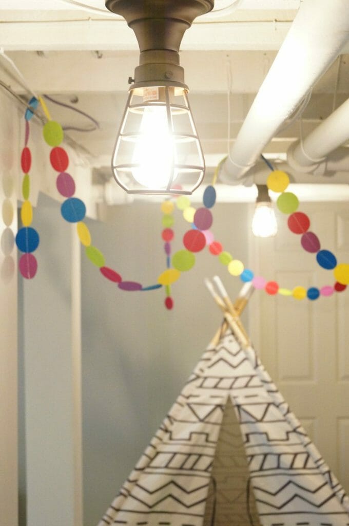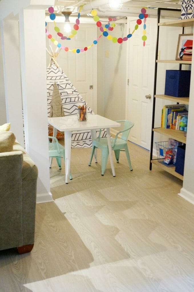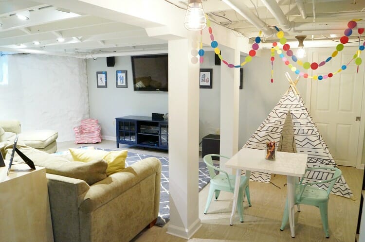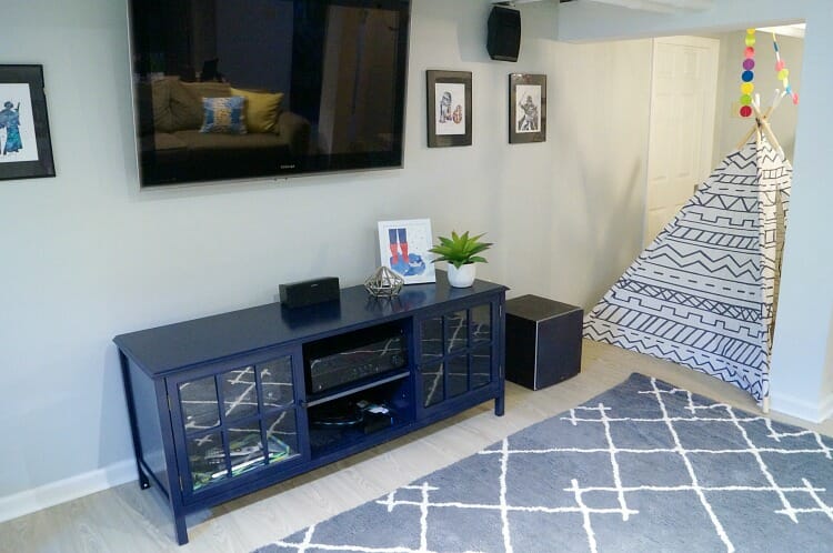 This basement has come such a long way! Wow! That little teepee is my favorite thing… is that weird? I probably wouldn’t even fit into it, but I truly love it! Such a great space for family time. Love the idea of adding a fireplace in the future.