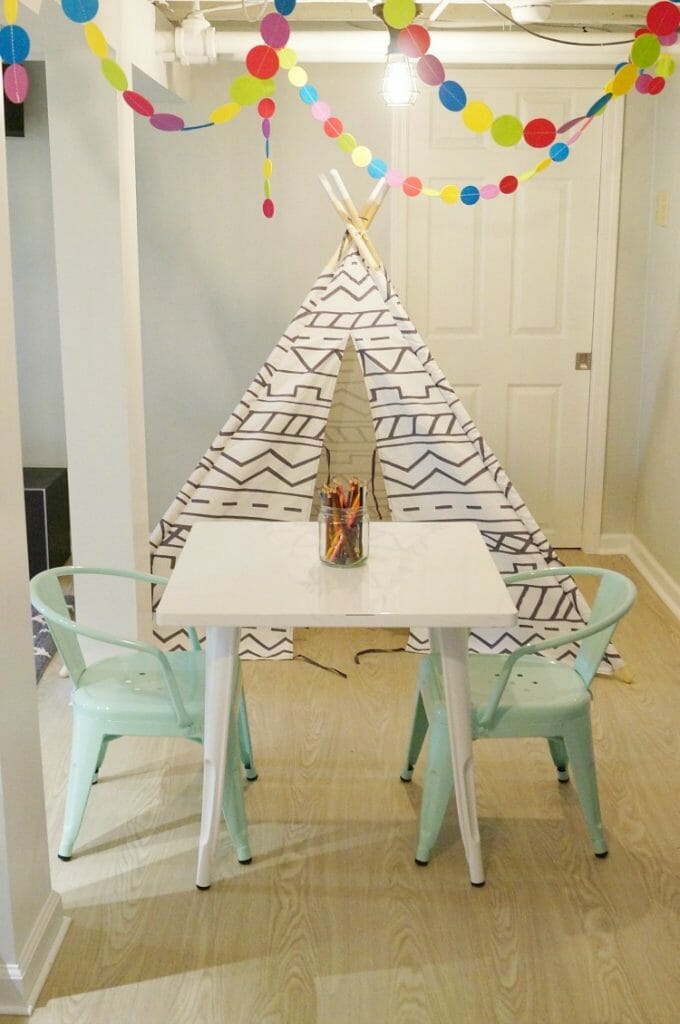 This is honestly so pretty and fun. I love the teepee, the rug and especially those metal chairs in mint green. Fabulous reveal. I hope you enjoy your space for many years to come.
