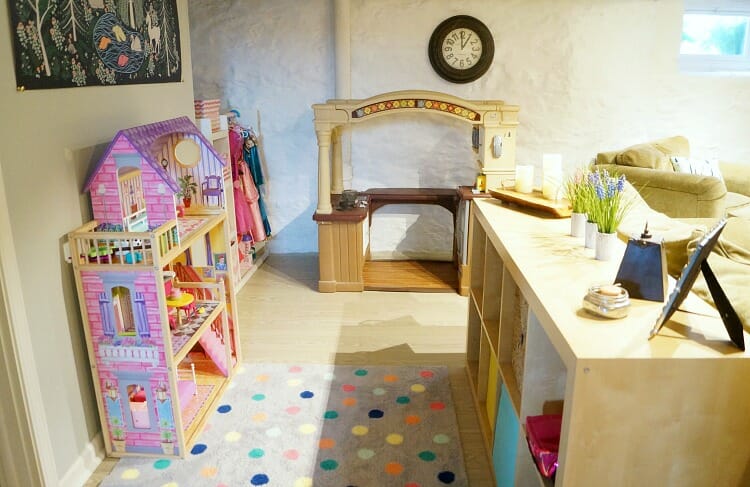 While I would love for this to be a sophisticated family room, this is truly a kid’s space and playroom. I added lots of fun items and tried to corral the toys as best as I could, but oh well, there are still tons of toys! One day I’ll miss stepping on Barbie shoes, right? 🙂