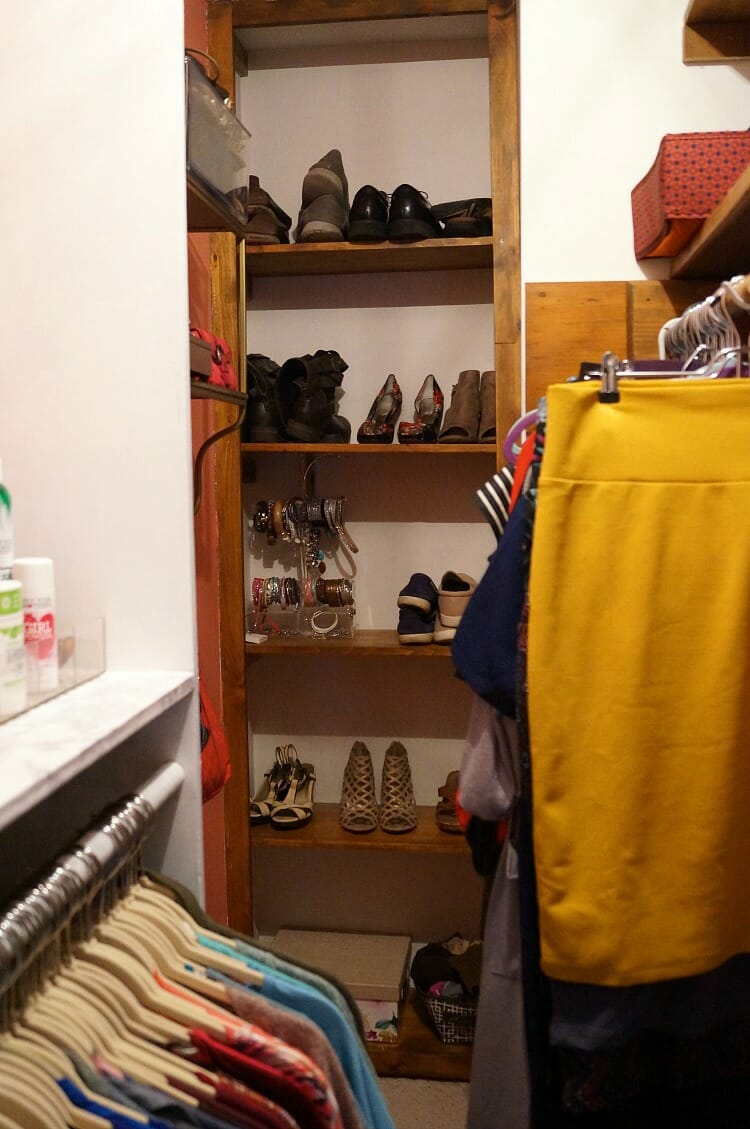 The back of the closet now houses my bracelets and shoes that I don’t wear on a daily basis. The bottom lidded basket has my winter stuff, gloves, scarves and hats. The wooden shelf on the wall holds my clutches and the upper clear bin is another fridge bin!