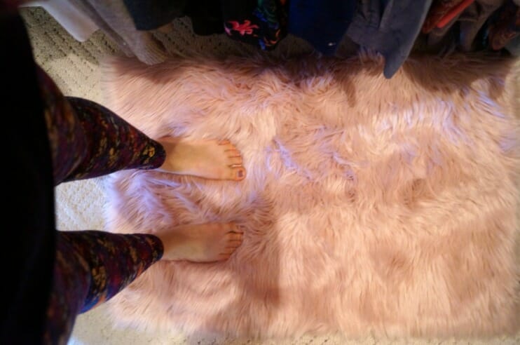 Light number 2 was a success (the first one wasn’t safe) and I love the pretty glow it puts on the ceiling! Much better than the dangling lightbulb I had originally! And to top the area off, a fuzzy pink carpet that makes the space extra girly and gives my feet a comfy spot to stand on while getting ready! At $20, it was a bit of a splurge when you only have $100, but I love the touch it adds, so it was definitely worth it!