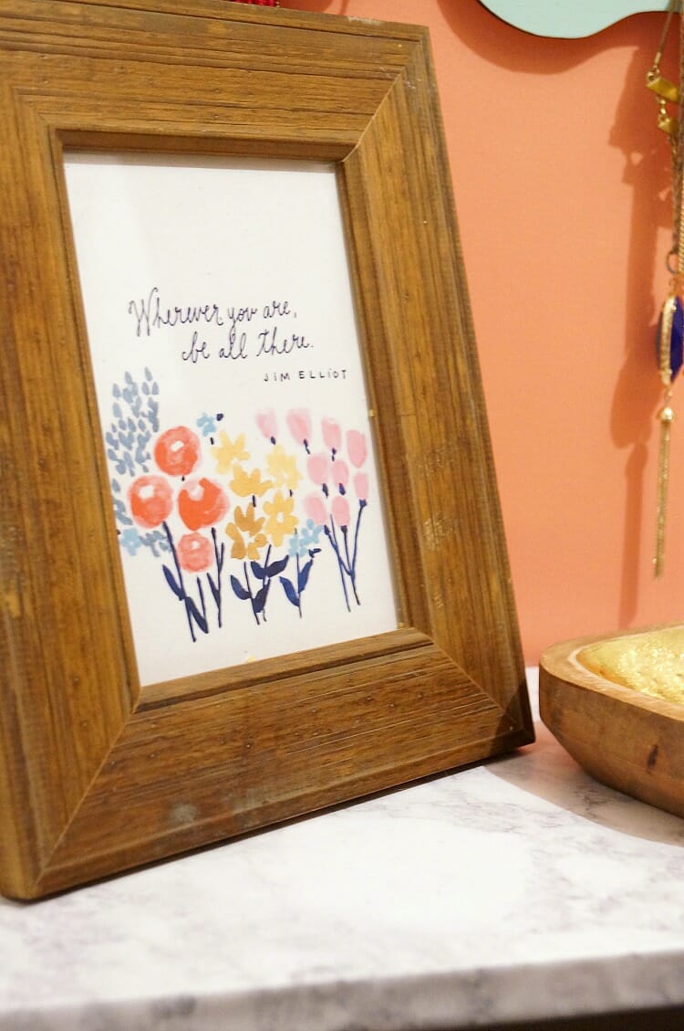 I got rid of a ton of jewelry and i love the faux marble shelf I added here. All of my hair products are now corralled in this pretty clear and gold chevron container and I love this little gold wooden basket for holding miscellaneous items. The quote in the picture frame is one of my favorites and I love having this in my closet as a reminder first thing in the morning. I had all of the other items and just had to purchase the gold bowl.