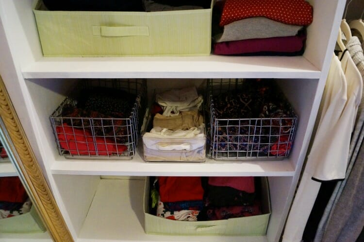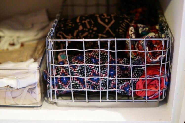 The green baskets work great for the items I have most of so that I don’t have to dig through the entire basket to find what I need. The metal crates are perfect for my legging collection and the clear acrylic basket holding my tank tops is actually a bin repurposed from my fridge!