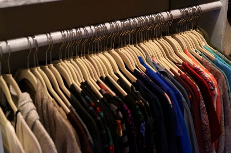Dresses and skirts are on the back part of the closet and I love these skirt hangers! I have a pencil skirt problem! I could probably purge this area just a little more and will work on that in the upcoming weeks. I used the green and purple velvet hangers I had already in this area so that I didn’t have to purchase any more.