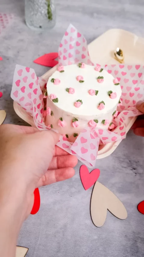 The design is sweet and personal, allowing you to pipe a short message or decorate with a few hearts. If you’re writing, thinking about Valentine’s dessert ideas that feel intimate, accessible, and memorable, this mini cake will hit the mark.