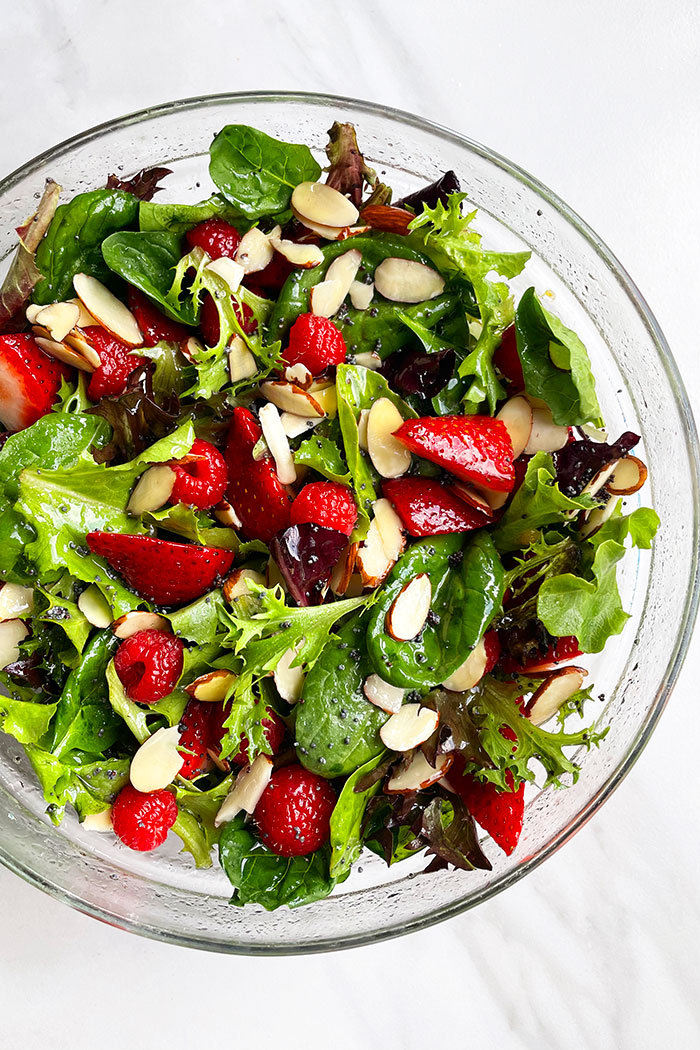 This easy Easter salad is quick, colorful, and made for a spring table. Start with leafy greens, then add strawberries and raspberries for a sweet, fresh bite. Almonds bring crunch and a little elegance. The jam vinaigrette makes it feel special with almost no effort.
