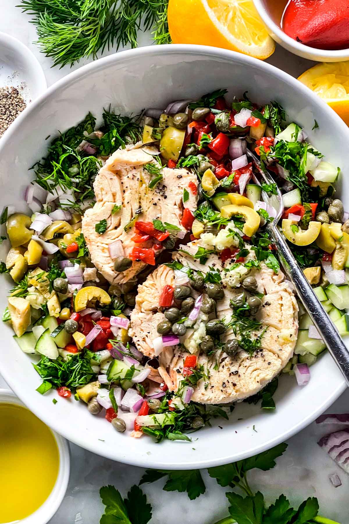 The dressing is simple and bright. It is lemon juice and extra virgin olive oil with garlic powder and Greek seasoning.