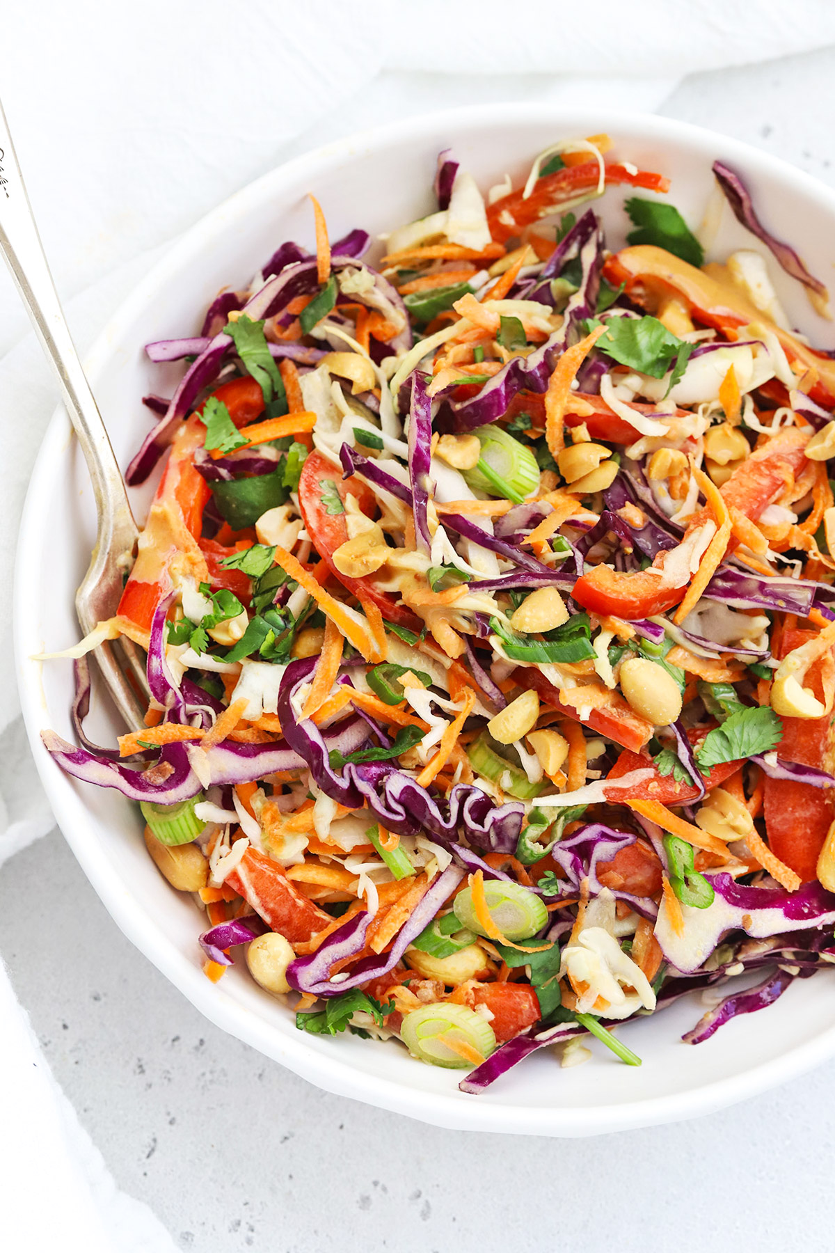 This crunchy peanut slaw tastes fresh, creamy, and zingy. It is packed with green cabbage, purple cabbage, carrots, and red bell pepper. Then green onions and cilantro keep it bright. The peanut dressing is the star, and it comes together fast.