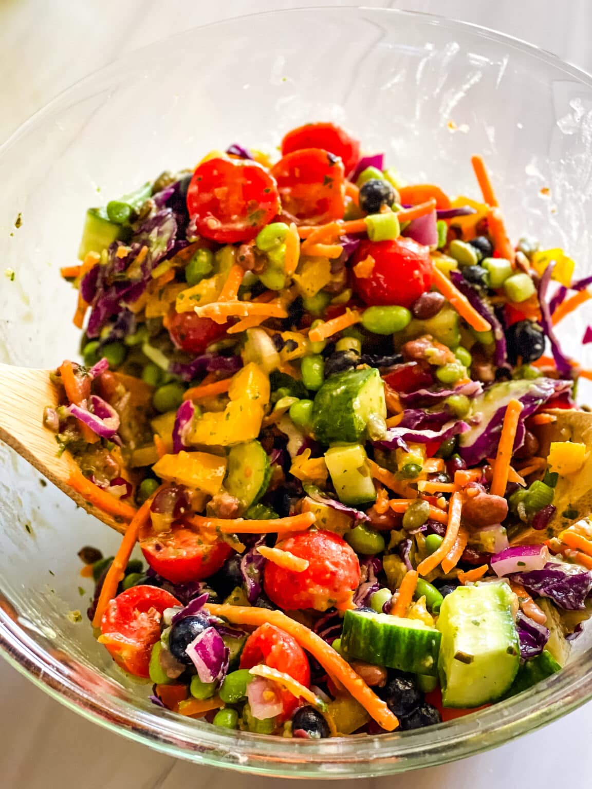 Choose your favorite dressing; vegan green goddess is a great match. Serve it at a potluck, or plate it as an easy weeknight side. Because it has no lettuce, it stays crisp even after tossing. I like leftovers chilled, then re-tossed before serving.