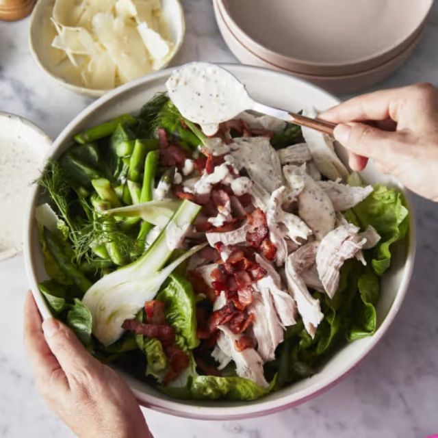 The quick dressing keeps it punchy. It uses lemon zest and juice, mustard, aioli, and fish sauce. So you get Caesar flavor without extra steps. Toss lettuce with spring onion, fennel, and asparagus. Then add shredded chicken and bacon. Spoon the dressing over the top, then finish with parmesan.