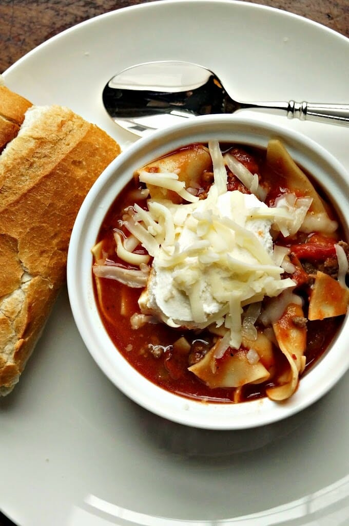 Spaghetti and Meatball Soup with Garlic Bread Croutons