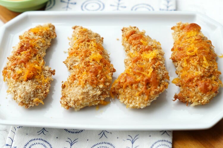 I served my cheddar and pretzel crusted chicken tenders with an amazing sriracha cheddar cheese sauce but they are also so good with my skinny buffalo chicken dipping sauce. My kids love to dip them in ketchup and ranch is always delicious with chicken, too!