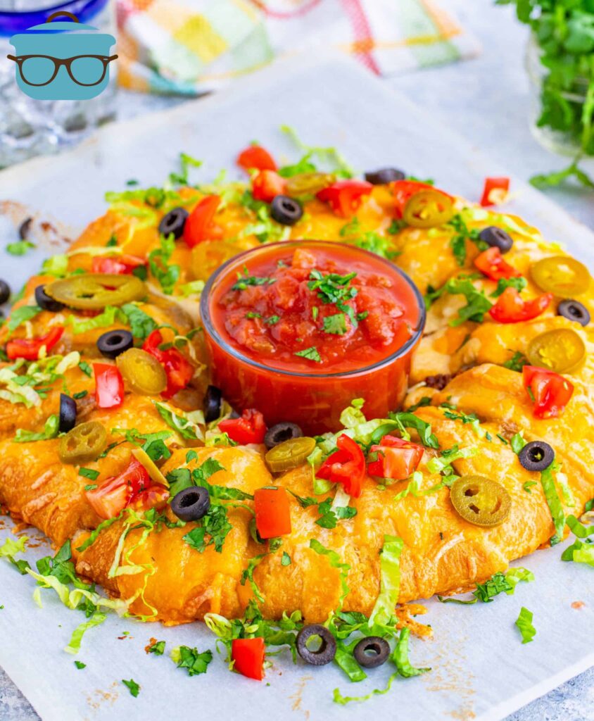 The ring bakes at 375 degrees until the crescents are puffed and golden and the cheese melts, about twenty to twenty-five minutes.  After baking, you fill the middle with salsa and pile on taco toppings like lettuce, tomatoes, olives, and jalapenos.