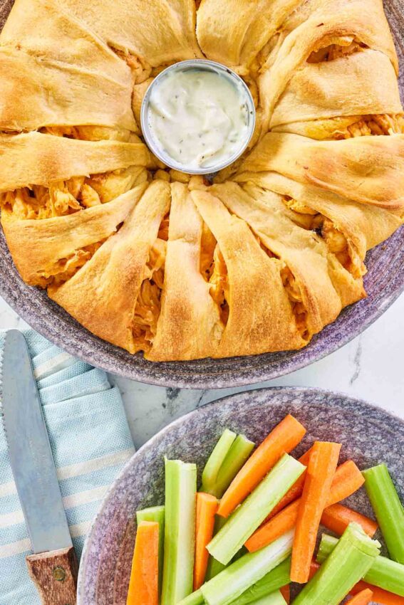 After a short rest, you slice it into wedges and serve it with ranch dressing in the middle plus carrot and celery sticks around the edges. It looks impressive, feeds up to sixteen people, and brings all the flavor of buffalo chicken dip in sliceable, handheld form that is perfect for game day grazing.