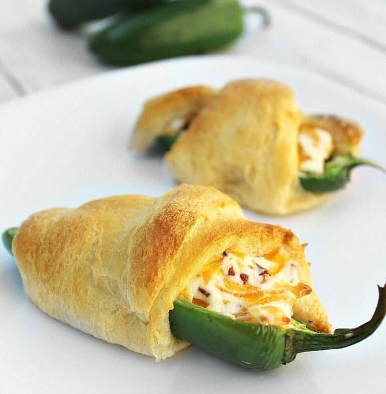 Each pepper half gets stuffed with the creamy mixture, then sits on the wide end of a crescent triangle. You roll from the base to the tip, so the dough wraps fully around the jalapeno. After a quick bake at 350 degrees, the crescents puff, the cheese melts, and the peppers turn tender but still hold their shape.