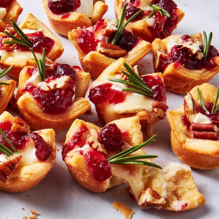 A small rosemary sprig on top makes each bite look like it came from a catering tray. The cups bake in about fifteen minutes, just long enough for the crescent dough to puff and the brie to melt into a gooey pool under the sweet tart cranberry sauce.
