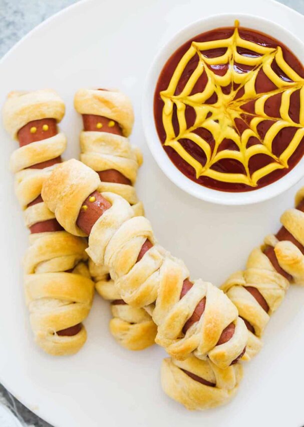 These mummy hot dogs aren’t just for Halloween, but they double as playful pigs in a blanket for Super Bowl parties, especially if you have kids at the watch party. Regular hot dogs or little smokies get wrapped in thin strips of crescent dough that look like bandages.
