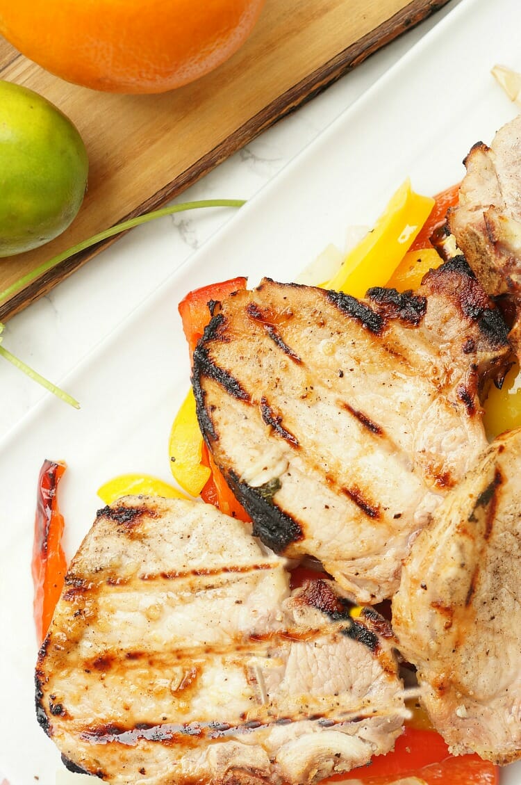 Cuban Grilled Pork Chops is a super flavorful and unique way to dress up your classic pork chop recipe! Bone in pork chops are marinated in a super tangy marinade of lime juice, orange juice, garlic, and cilantro, then grilled to perfection with onions and peppers!