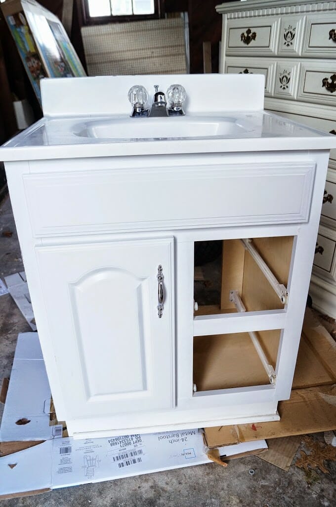 The vanity we decided to use was my parents and they were throwing it away. I painted it and changed the hardware and it looks brand new now!