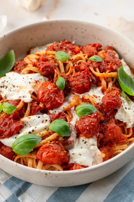 Elegant and minimalist, this dish uses blistered cherry tomatoes, garlic-infused oil, fresh basil, and creamy burrata to create a luxe pasta experience in under 30 minutes.