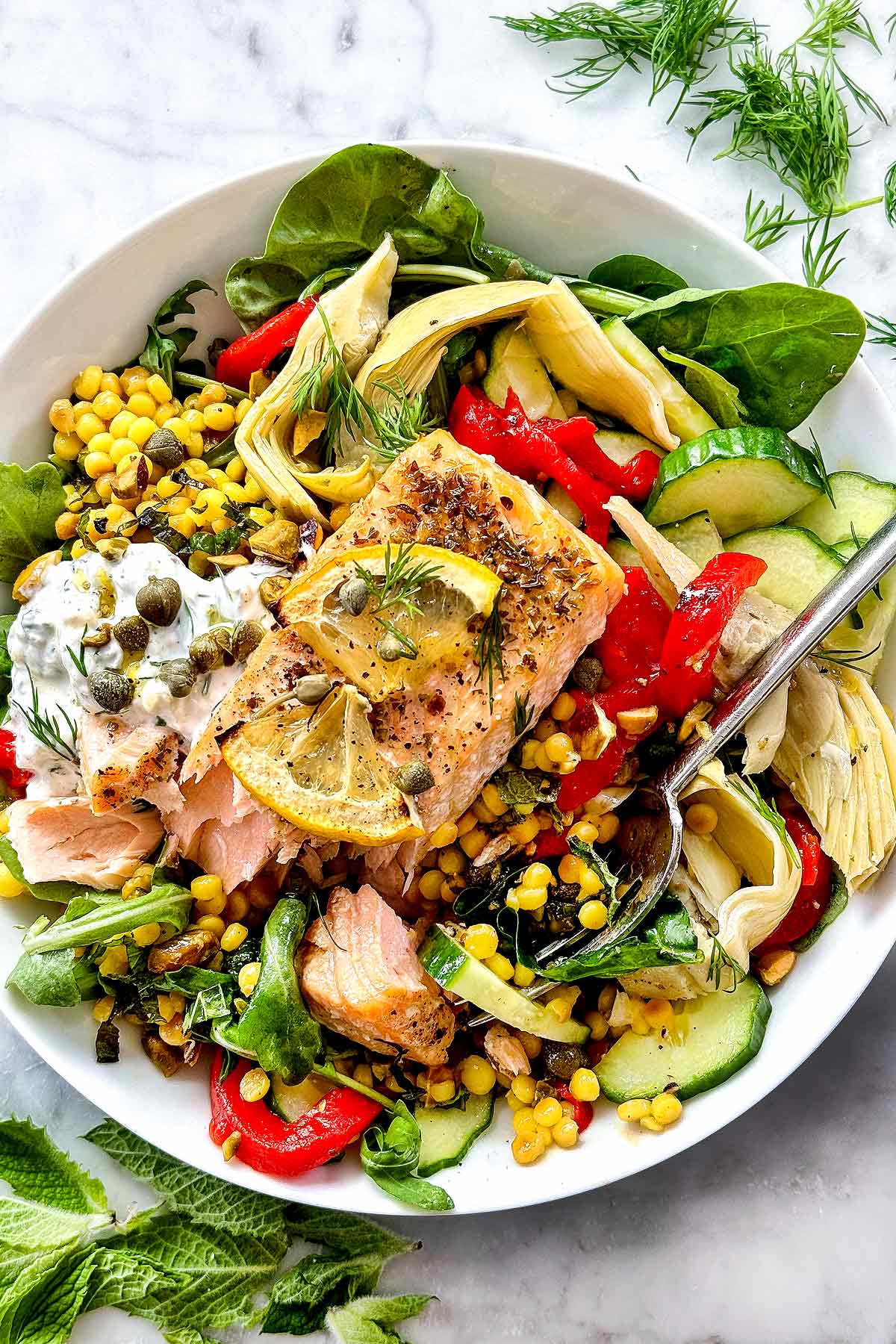 Tzatziki ties it together, using grated cucumber, Greek yogurt, garlic, dill, and red wine vinegar. Next, build bowls with leafy greens, couscous, salmon, and capers. I love serving everything at room temperature for easy prep.