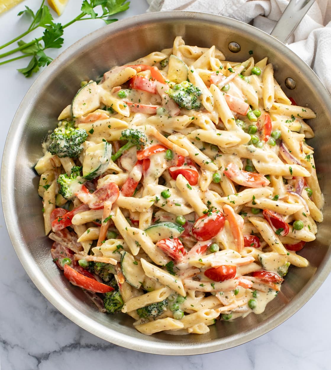 Pasta primavera is the spring dinner I make when I want comfort and color. However, it still feels fresh. This recipe uses penne and a savory herb cream sauce. First, you sauté broccoli, onions, carrots, and bell peppers in olive oil. Then you add zucchini, tomatoes, and peas, so the pan stays vibrant.