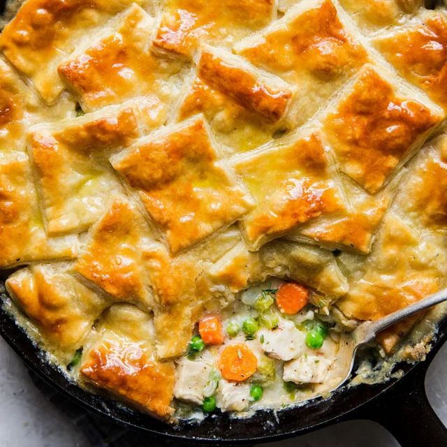 This skillet chicken pot pie brings classic comfort, yet it fits a busy weeknight. Frozen puff pastry is the shortcut, so the top turns flaky with little effort. First, sauté onion, celery, and carrots in butter until softened. Then stir in flour, salt, pepper, celery seed, garlic powder, and fresh thyme. Next, whisk in milk and chicken stock until the sauce thickens like gravy. Add frozen peas and cooked shredded chicken, then stir until hot. After that, roll puff pastry and cut it into small squares. Layer the squares over the filling, then brush with egg. Bake at 425°F until golden and bubbly.