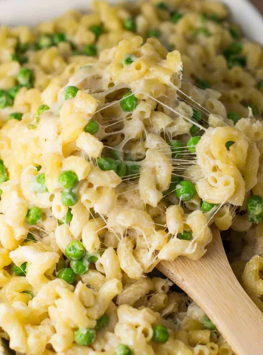 Then, heavy cream and milk are whisked in until the sauce thickens. Next, cheddar and mozzarella melt in for a rich, stretchy finish. Frozen peas add sweetness and bright green bites.