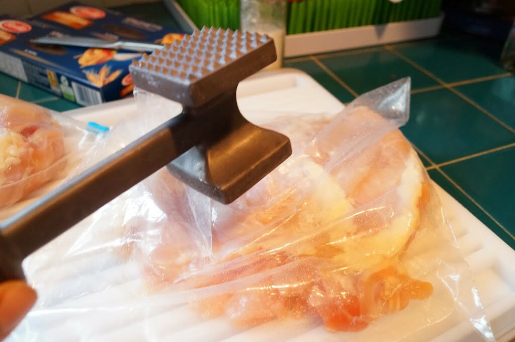 To begin, pound your chicken. Place your chicken in a zip lock bag, sealed tightly, and pound the chicken using a meat mallet.