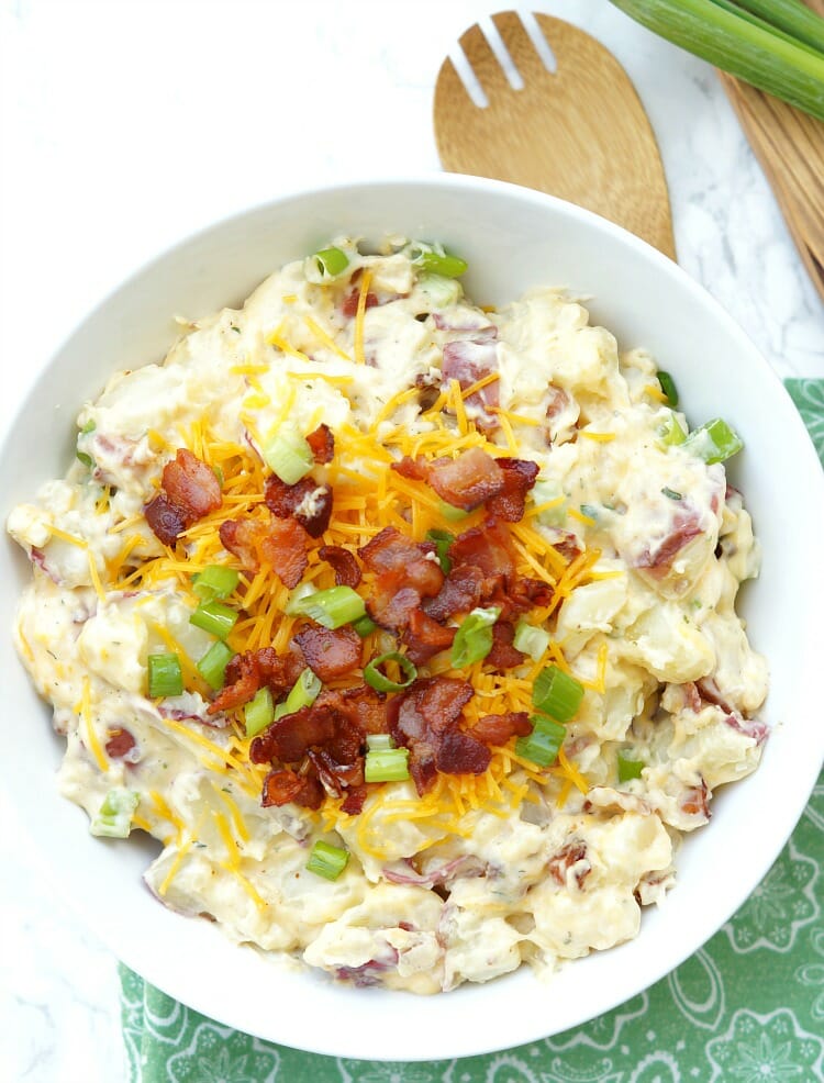 In a large mixing bowl, add the potatoes and then mix in the sour cream mixture. Add the cheese, bacon pieces, and green onions. Serve immediately hot or refrigerate until serving.