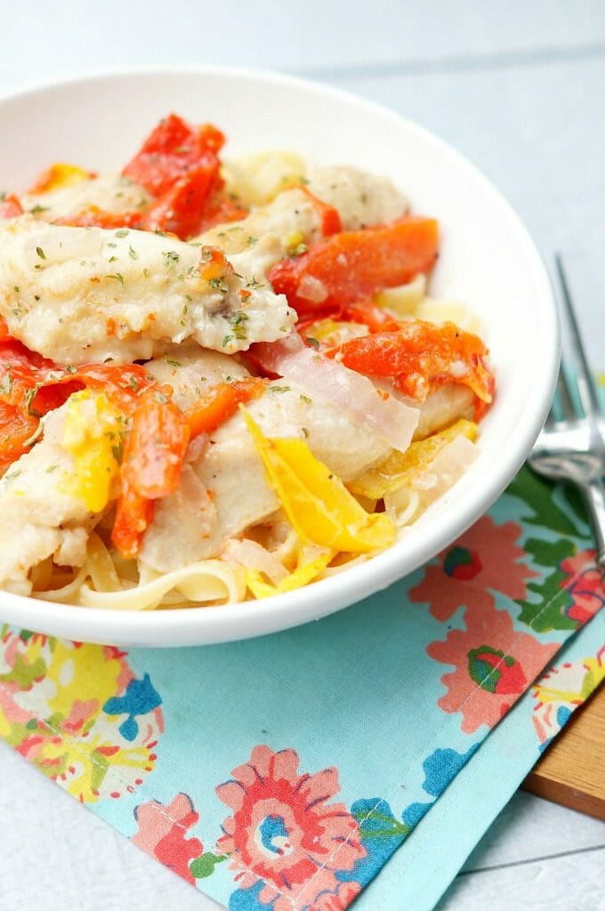 Scampi sauce is traditionally a garlicy white wine sauce, but to add even more flavor, I throw colored peppers and red onion into the mix. You can also eat more pasta when there’s veggies involved, too 🙂 I am always down for adding more pasta to my plate!