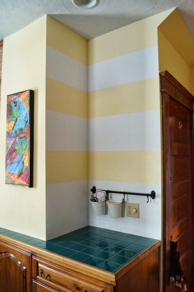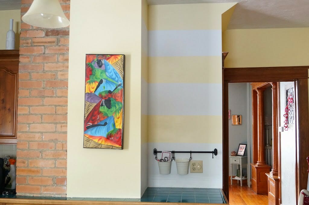 In the very beginning of this blog, which was only a few months ago, I posted this Too Much Coffee post, which chronicled how we ripped down an unused wine cabinet in the kitchen and I painted stripes on the wall. You can see the spot I’m referring to peaking out here in the right hand corner of this picture. This is unfortunately the best before picture I have!