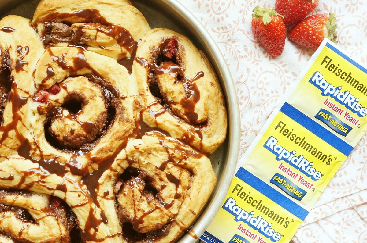 These Nutella and Strawberry Cinnamon Rolls are an amazingly delicious beginner cinnamon roll recipe, kicked up with the addition of Nutella and juicy strawberries! Homemade cinnamon rolls are easier than you think and when you use Fleischmann’s® RapidRise® Yeast – super fast, too!