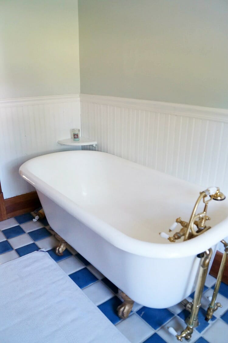The biggest transformation is the white beadboard! The beadboard got a coat (more like four million coats) of Benjamin Moore White Dove. Looking at the pictures, I think I want to paint the trim now too. Our house is 115 years old and much of the wood in the house is original. I have a problem with painting original wood, but I think that the wood in the bathroom is newer than the rest of the house because it doesn’t have the same sheen. I am going to tackle painting the trim this week, I think! It will probably take a million coats too!
