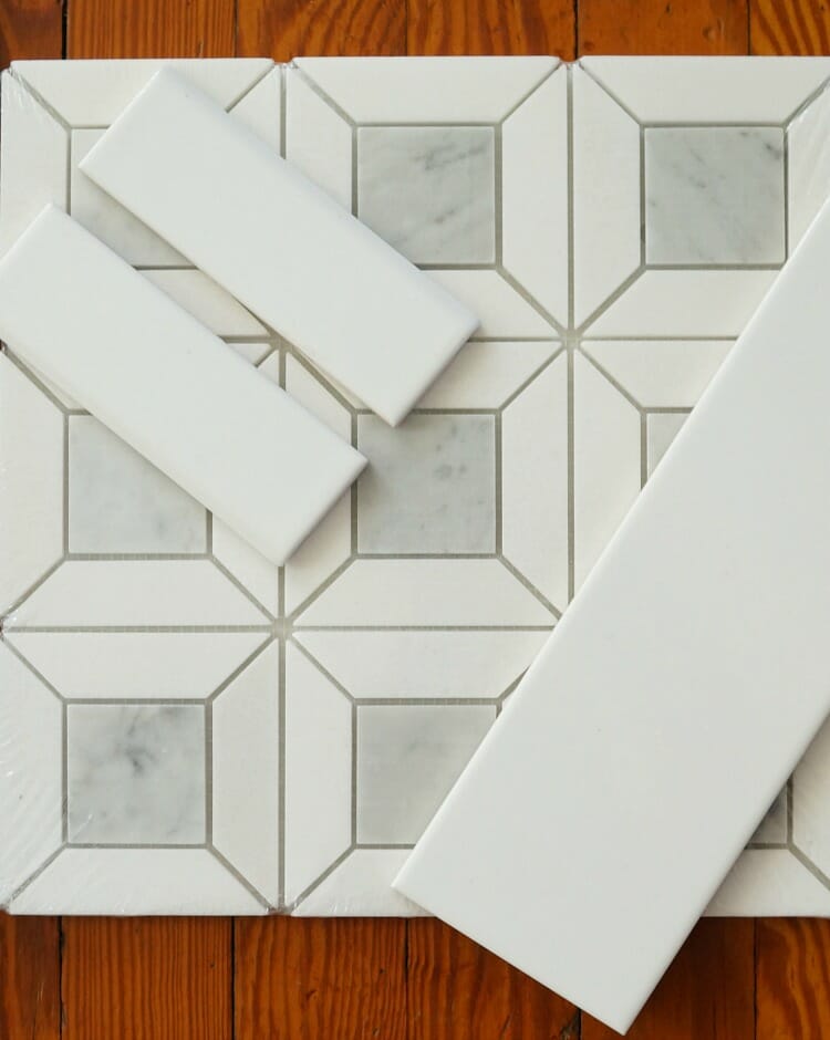 The thing I am most excited to share with you this week is a sneak peak of the floor and shower tile!! This is just a quick phone picture, but isn’t it gorgeous?!