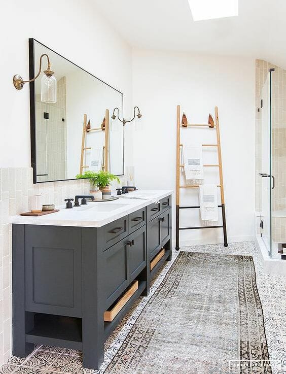 I need to pick up a bathroom carpet and a shower curtain this week. I am hoping to find something simple and classy. Here is a tile reminder in case you missed last week! I need a neutral rug that is going to add softness, but not compete with the tile pattern!