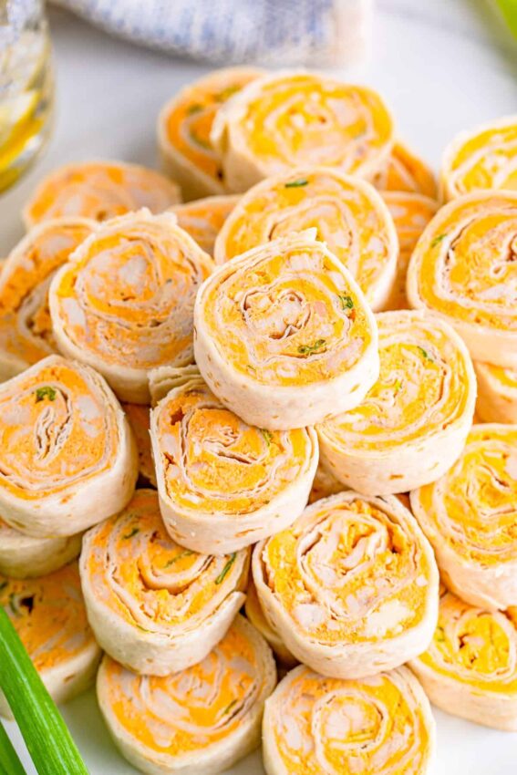 The wraps roll up tightly, chill until firm, and then slice into thick pinwheels that hold together well on a party tray. Every bite hits the familiar buffalo notes, tangy, a little spic,y and very cheesy, without feeling messy.