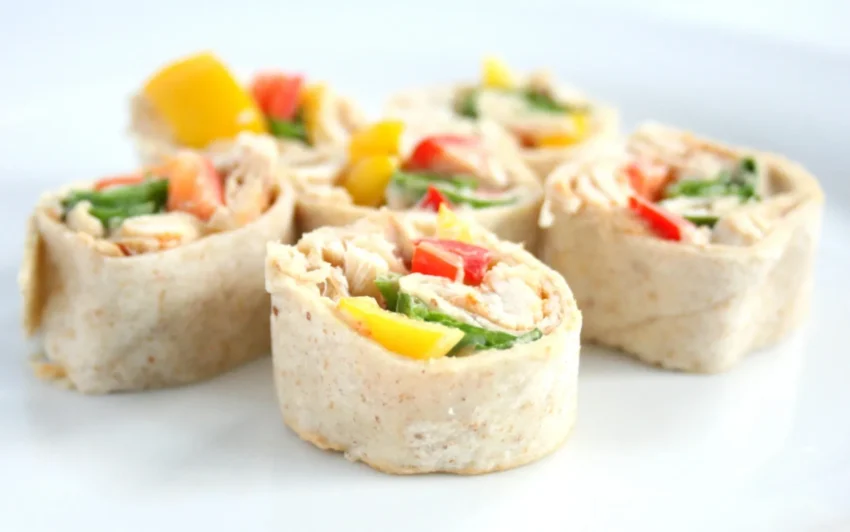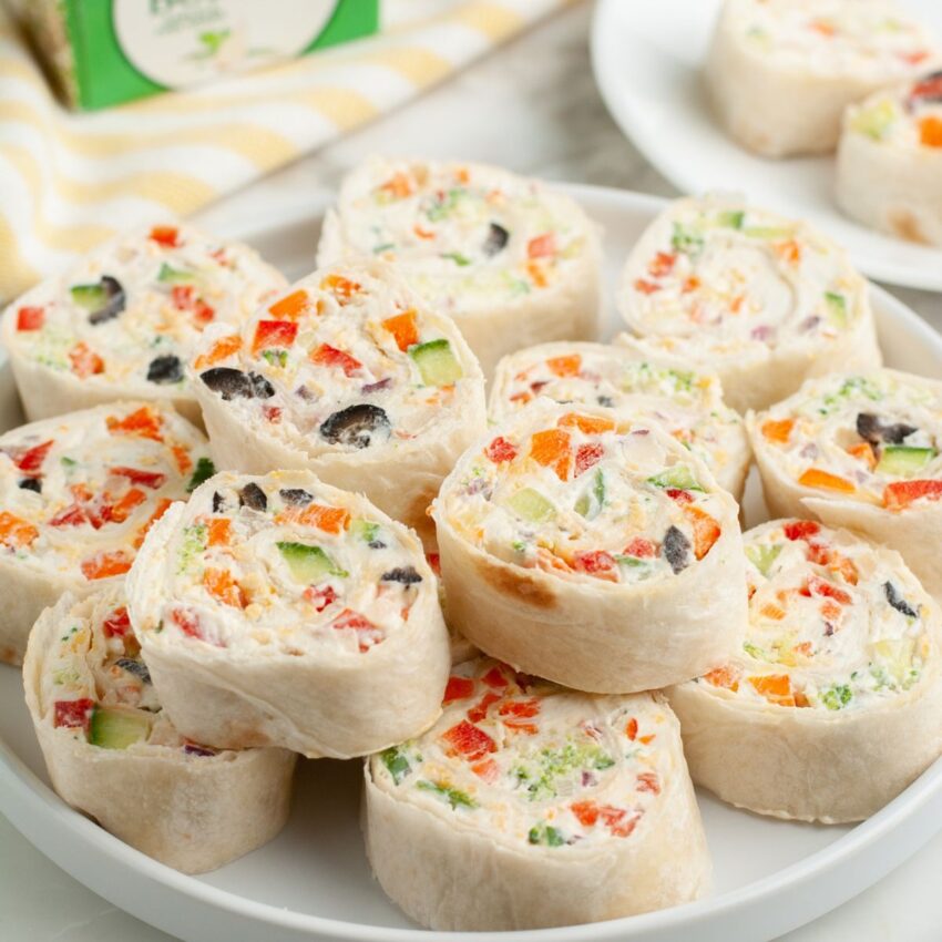 Think bell peppers, carrots, and other crisp veggies that hold their bite once rolled and chilled. The mixture spreads over soft tortillas, which are then rolled into tight logs and chill before slicing.