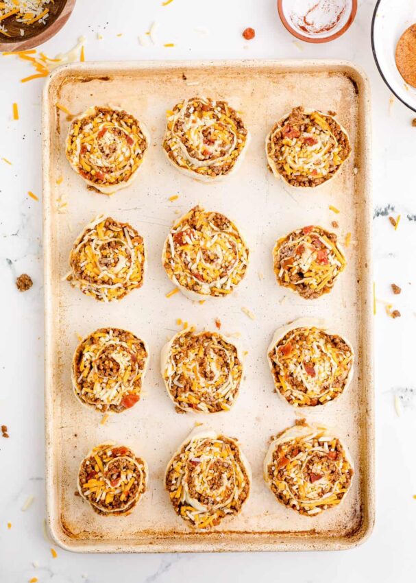Mexican blend cheese melts into the hot meat, turning the mixture rich and gooey. You spread it over the pastry, roll everything into a log, and slice it into thick spirals.