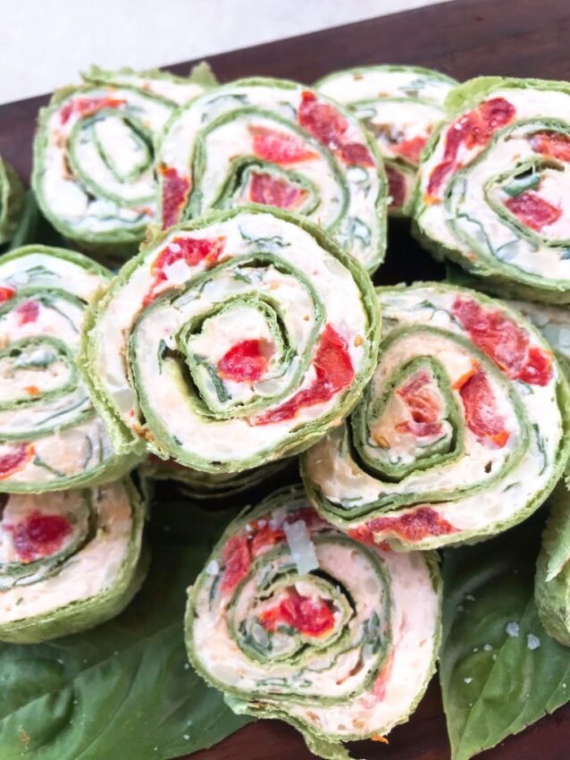 Once set, you slice them into colorful spirals that show off the red tomatoes and green basil. The flavor is bright and herby, with creamy cheese in every bite, so they pair nicely with heavier wings and dips.