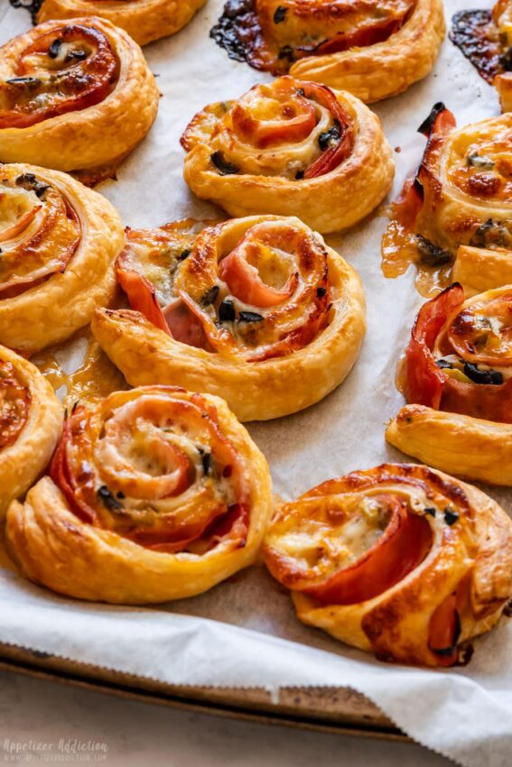 These ham and cheese pinwheels are your easy, crowd-pleasing Super Bowl classic. Puff pastry gets a swipe of sweet chili sauce, then a generous layer of deli ham, melty cheese, and finely chopped olives.