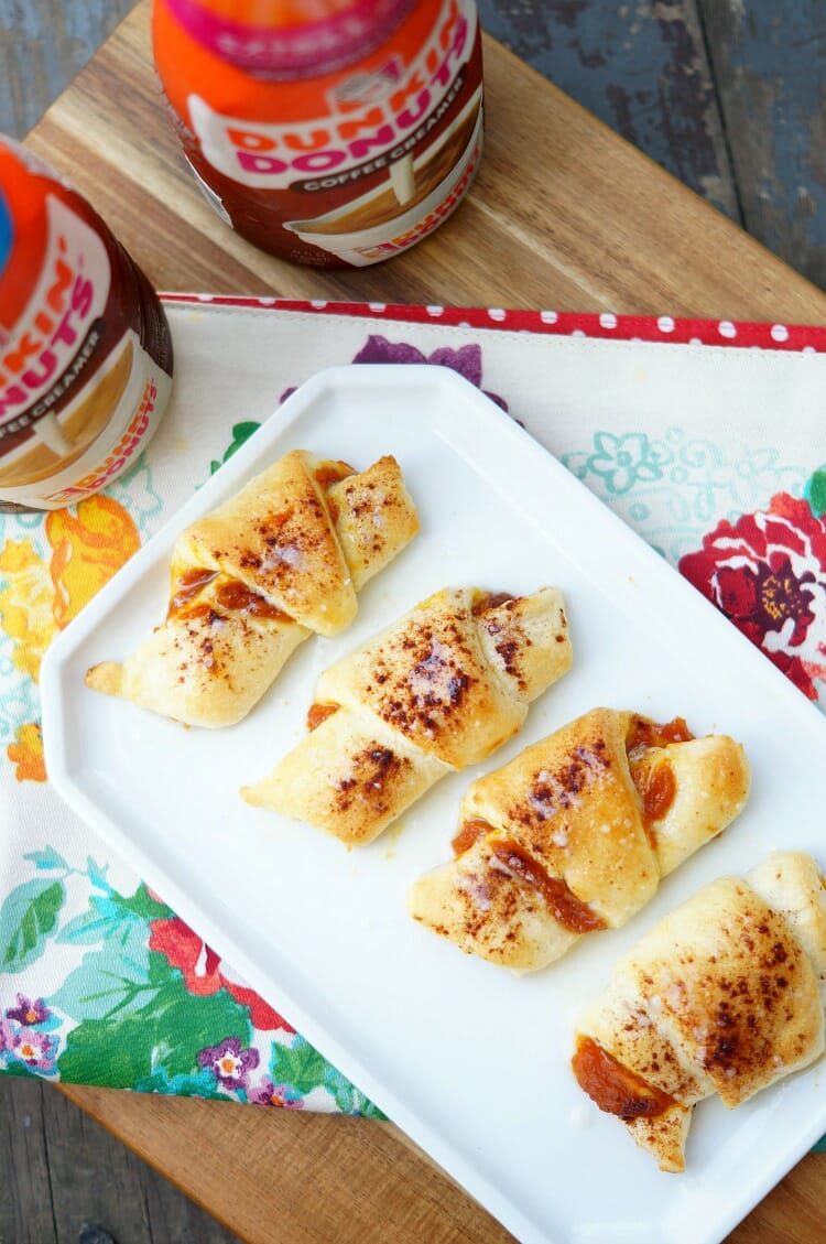Not only do I use the creamer in my coffee, but the Dunkin’ Donuts® Extra Extra Creamer is the perfect liquid for making the drizzle that goes over these roll ups! It is perfectly creamy and sweet and pairs perfectly with the flaky crescent dough. I love using coffee creamer in my icings and it is one of my secret baking tips! The vanilla or caramel variety are also perfect for making drizzles and would pair perfectly with these delicious pumpkin rolls!