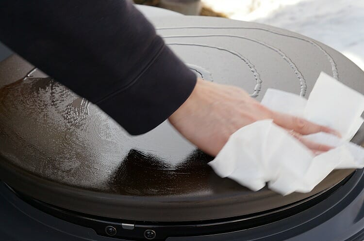 The griddle arrives slightly seasoned but a little more work is required straight out of the box. You want to start with some soapy water and a paper towel to wash off the shipping oil. Dry the surface well. Next you want to select your oil. Flaxseed oil gives great results but you can also use EVOO, vegetable oil, or soy oil.