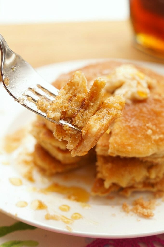 Set pancakes aside. Once done, dip each pancake in the melted butter and then the cinnamon sugar mixture. Serve immediately. If you have any melted butter and cinnamon sugar left, mix together and top the pancakes!