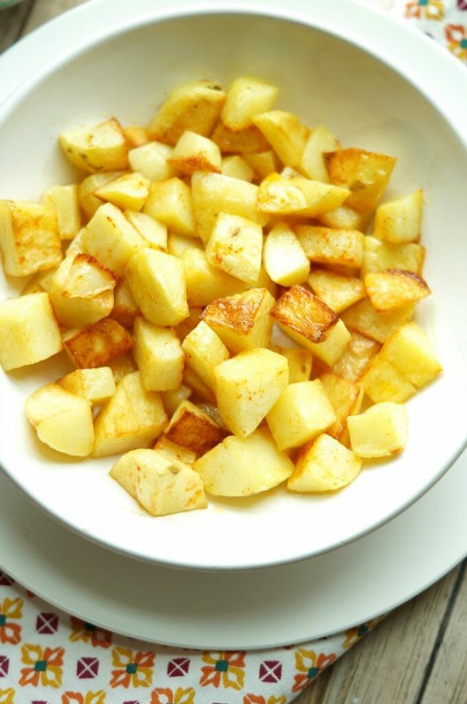 To shave off a few calories, I fried my potatoes in the oven. Not only does my kitchen stay cleaner without oil being splattered everywhere, but I can eat an even bigger portion since they were done in the oven! Head over to SoFabFood for the recipe and to see my pro tip on how to get potatoes extra crispy in the oven!
