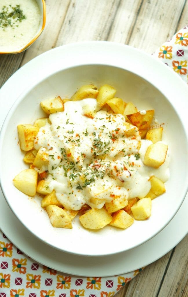 I couldn’t get enough of these delicious fried potatoes topped with a creamy garlic sauce.
