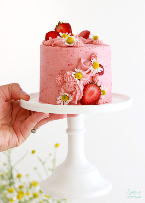Designed for two, this mini strawberry-layer cake is ideal for a Valentine’s date-night treat. Infused with fresh strawberry purée and topped with strawberry-buttercream (enhanced with freeze-dried berry powder), the flavor is bold yet refined.