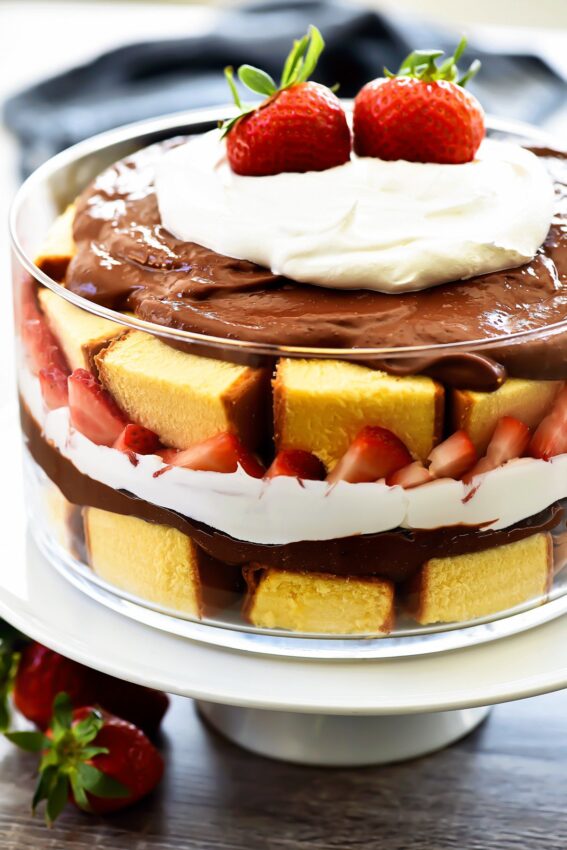 The clear trifle bowl displays the vibrant red strawberries and chocolate layers, instantly adding romantic flair to the table. Serve chilled, scoop straight from the dish, and let the textures of cake, creamy pudding, and juicy fruit melt together for a dessert that tastes as beautiful as it looks.
