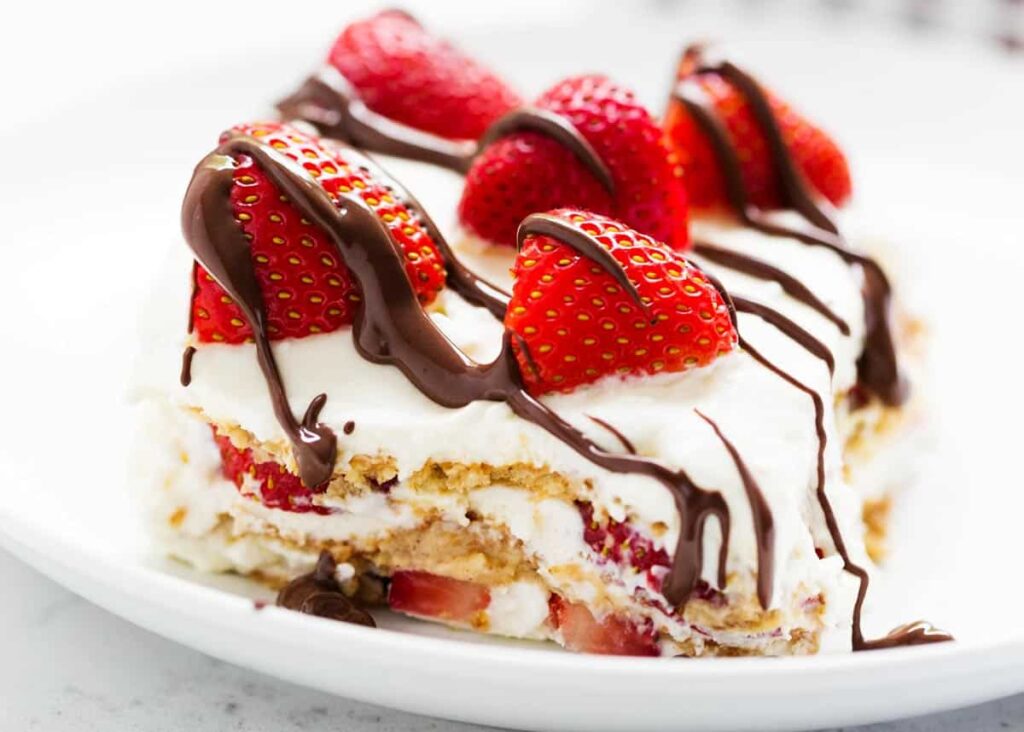 This no-bake layered dessert feels effortlessly elegant, ideal for a Valentine’s celebration when you want something beautiful but stress-free. Crisp graham crackers soften into cake-like layers, flanked by whipped cream and cream cheese filling, then crowned with ripe strawberry slices.